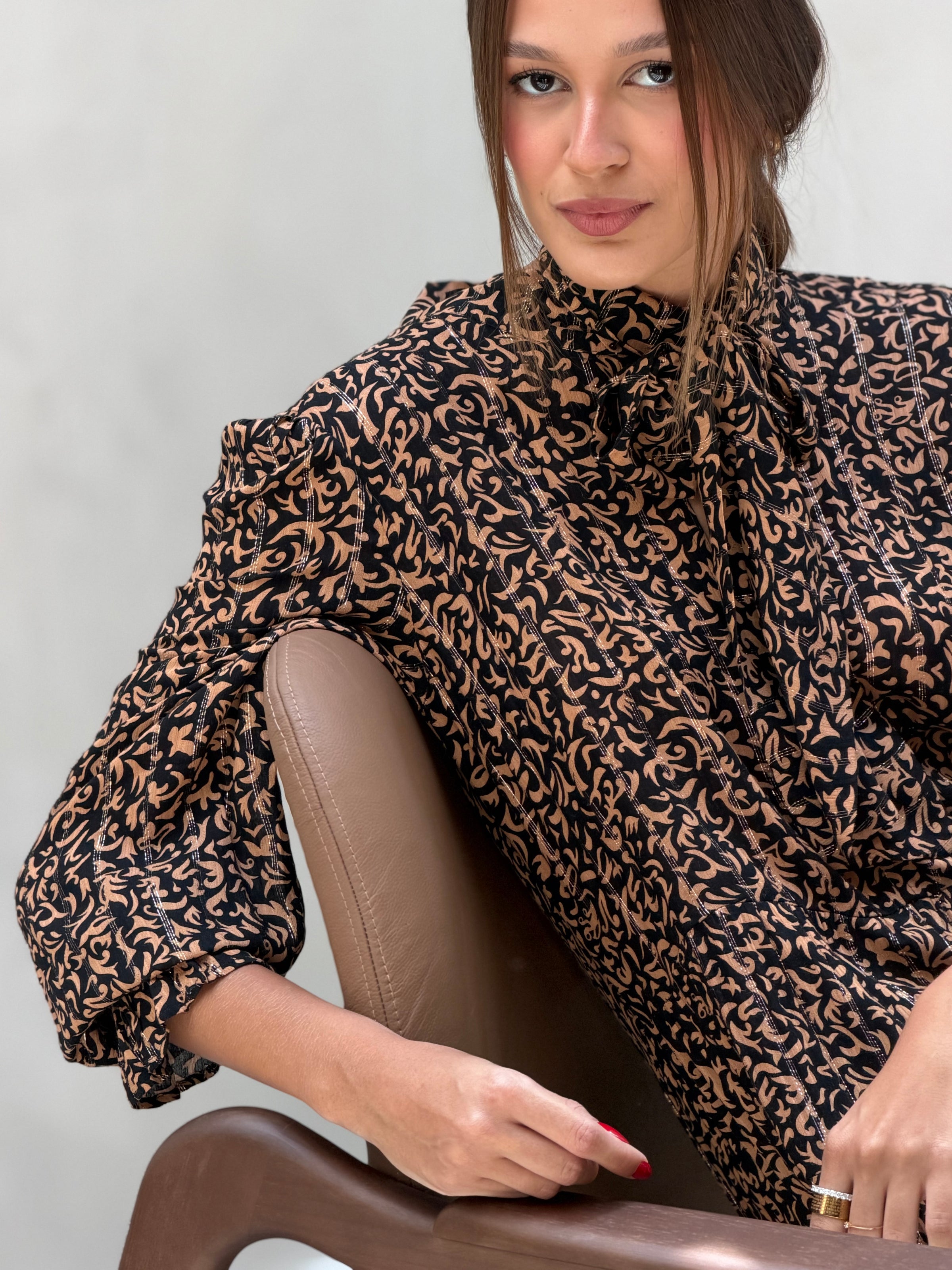 Feito na viscose foil , tecido leve e fluido com aplicação de película metalizada, criando um efeito de brilho sofisticado.